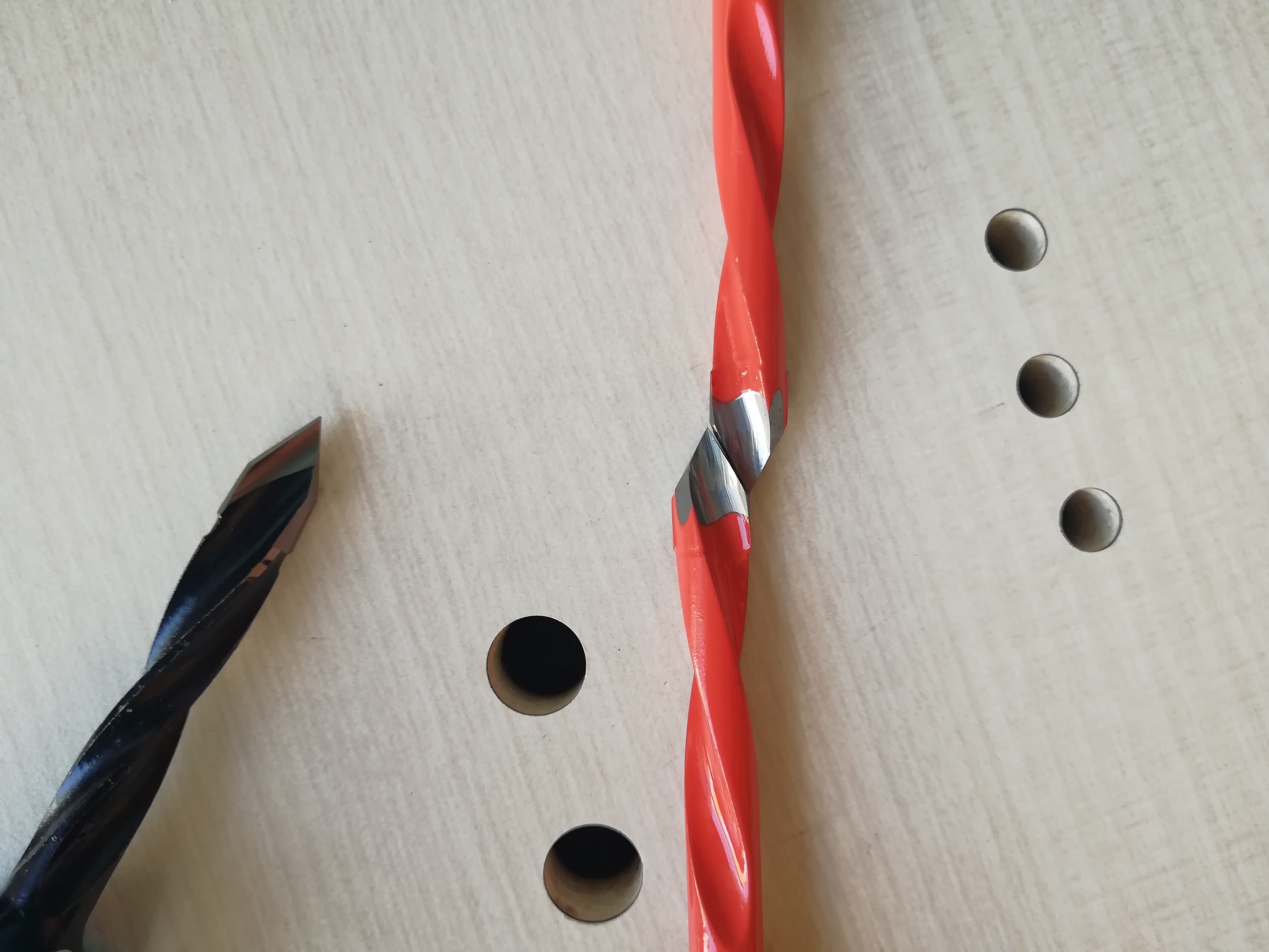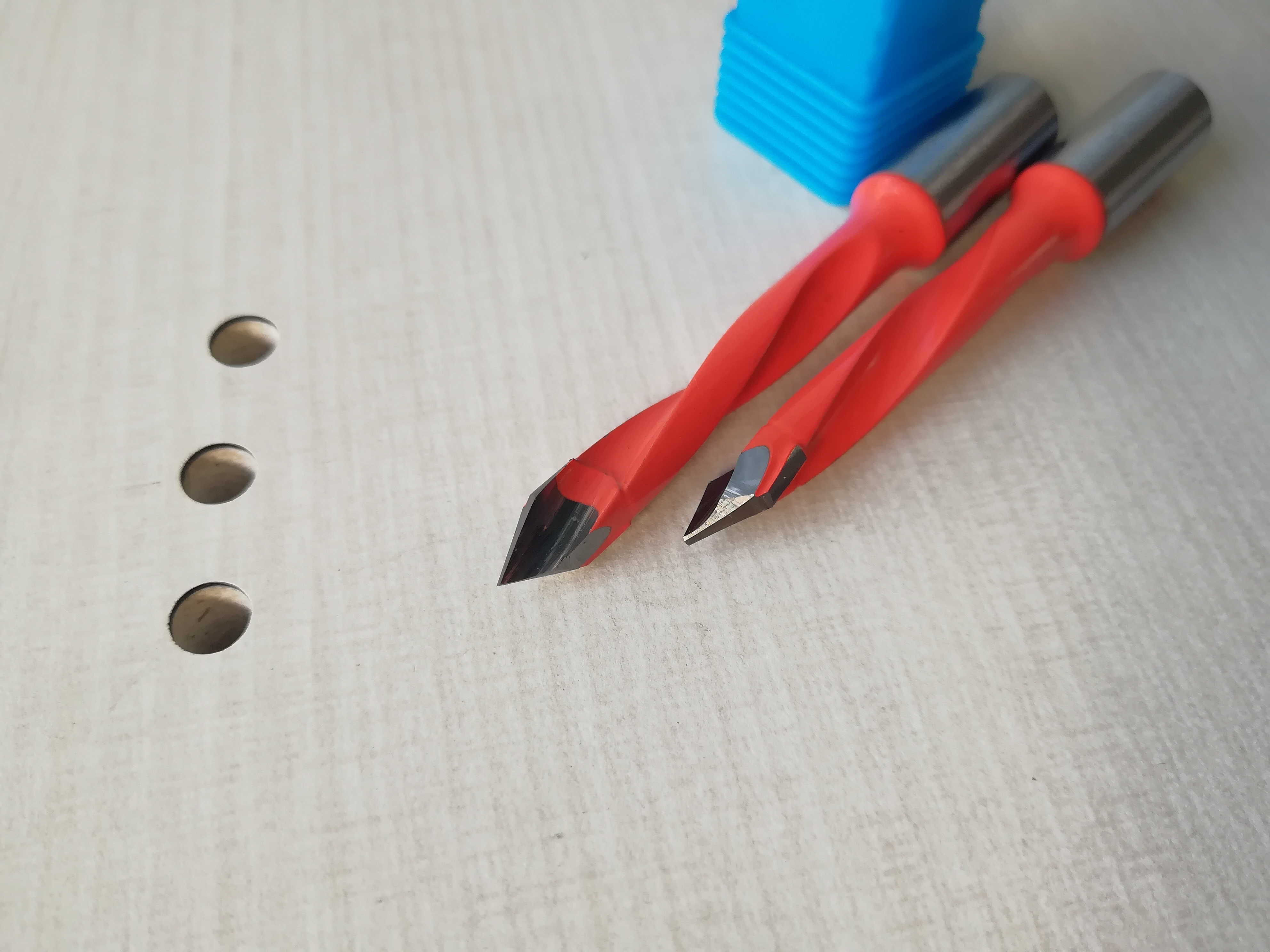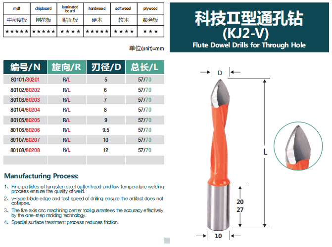 V-point drill bits or through-hole bits are widely used to drill through solid wood or wood composites for the insertion of dowels. YASEN factory offers high-precision and long-lasting V-point dowel bits for creating clean holes with high efficiency. Our advanced flute design allows for the best accuracy, smooth chip removal, and burr-free holes. Both TCT and solid carbide through boring bits are available. The carbide-tipped V-point bits range from 5mm to 12mm in cutting diameter, while our solid carbide bits size from 3mm to 8mm in cutting diameter. Our V-point dowel drill bits feature standard overall lengths of 57mm and 70mm, coming with both left-hand and right-hand rotations. You could make your choice based on the diameter needed, the overall length, and the rotation type of the boring bits